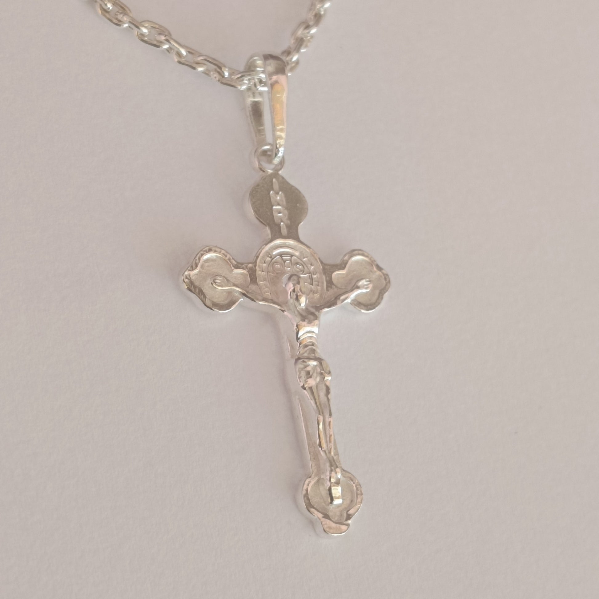 This sterling silver cross pendant necklace combines authentic religious symbolism with refined craftsmanship. Fashioned from 925 sterling silver, the crucifix features intricate detailing and decorative borders that enhance its spiritual significance. The adjustable 47 + 6 cm chain accommodates various necklines and preferences. Engineered for resilience against tarnishing, this piece withstands daily wear while maintaining its lustrous finish. Equally suited for men and women, it serves as a meaningful gift for confirmations, communions, or as a personal expression of faith. A versatile accessory that transcends occasion and style.